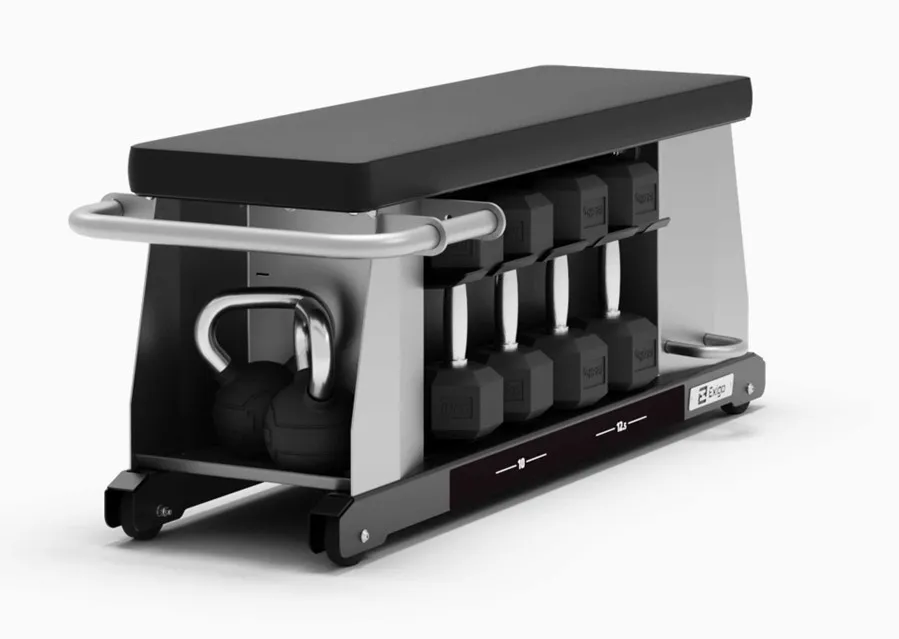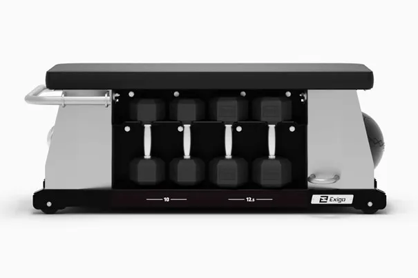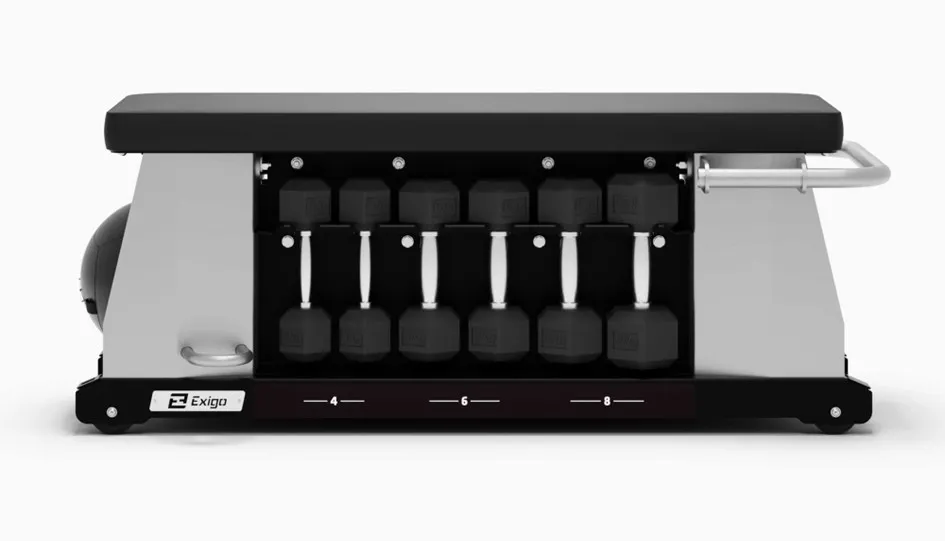 Le banc HIIT d’Exigo est un banc polyvalent qui est utilisable pour diverses séances d’entraînement et qui est idéale pour les cours en studio et les petites salles de sport. Il est conçu pour stocker jusqu’à 5 paires d’haltères ainsi que d’autres accessoires tels que des kettlebells, médecine-balls ou autres articles similaires