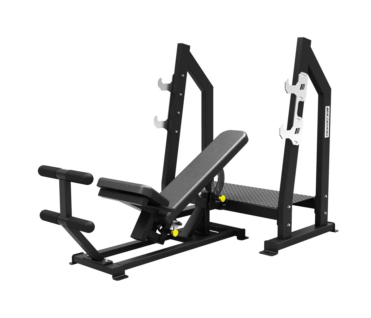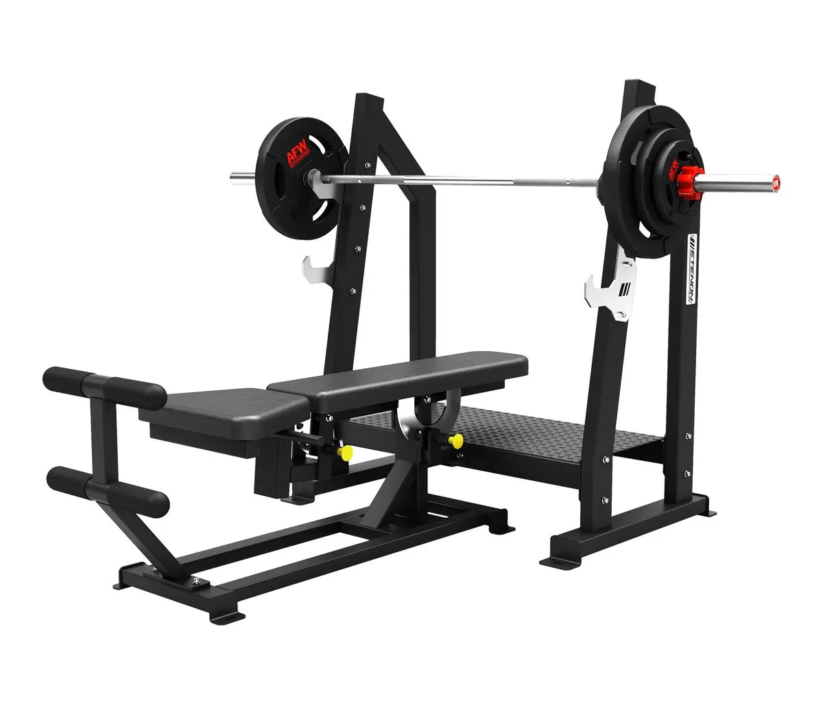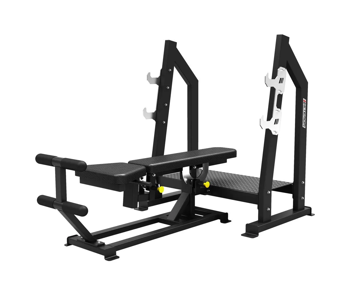 Le banc propose deux niveaux de supports de barre olympique, ce qui autorise également l’utilisation d’haltères bloquées préchargées.