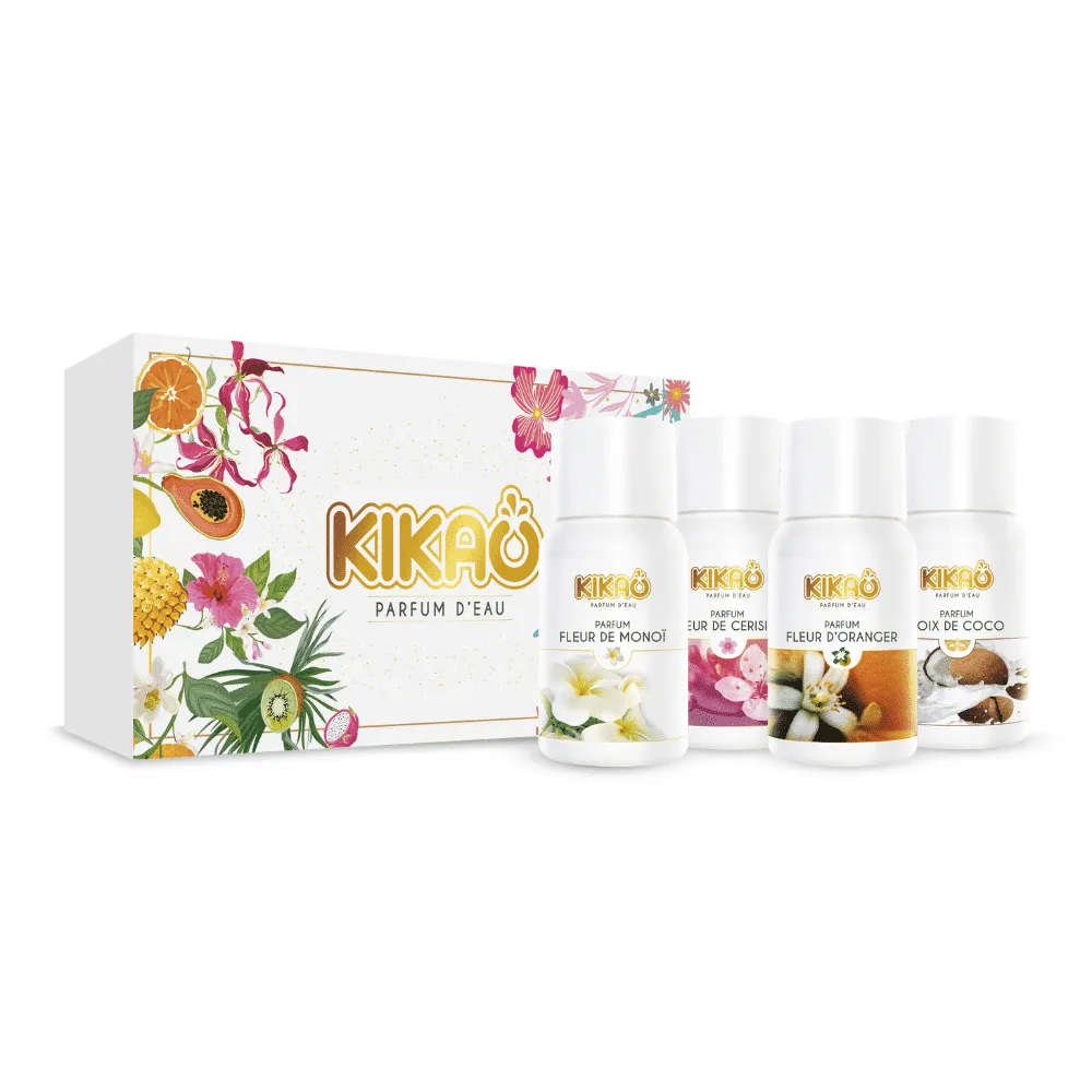 Le coffret parfums d’eau Floraux Kikao est un ensemble de 4 parfums, pour spa ou petite piscine, de 30mL chacun.