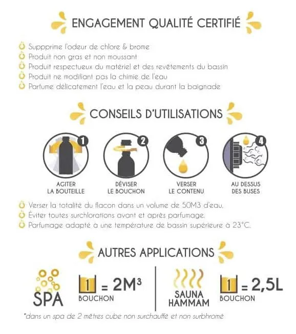 Vous pourrez profiter de ce parfum dans les saunas, piscines, jacuzzis, bains, spas et diffuseurs.