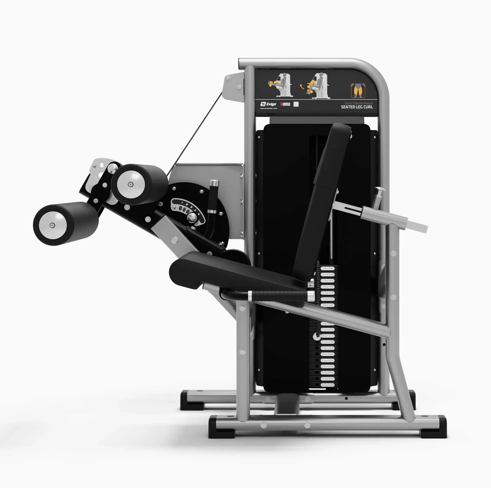 La machine Leg curl ischio-jambiers 1105-1 de Exigo Fitness isole et développe efficacement les muscles ischio-jambiers de l’arrière des cuisses par repliement des jambes.