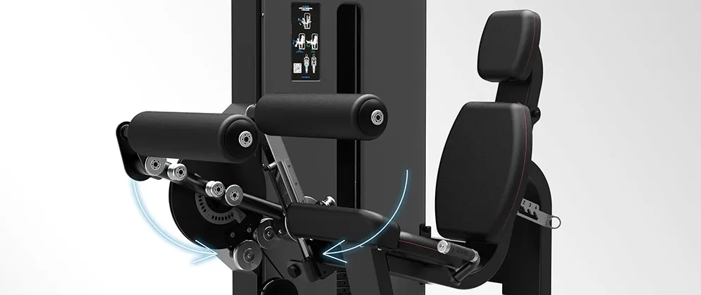 Fixation réglable de la jambe au moyen de roulements linéaires et d’un piston à gaz qui facilite le réglage et garantit l’exécution des exercices d’extension et de flexion avec une précision maximale.