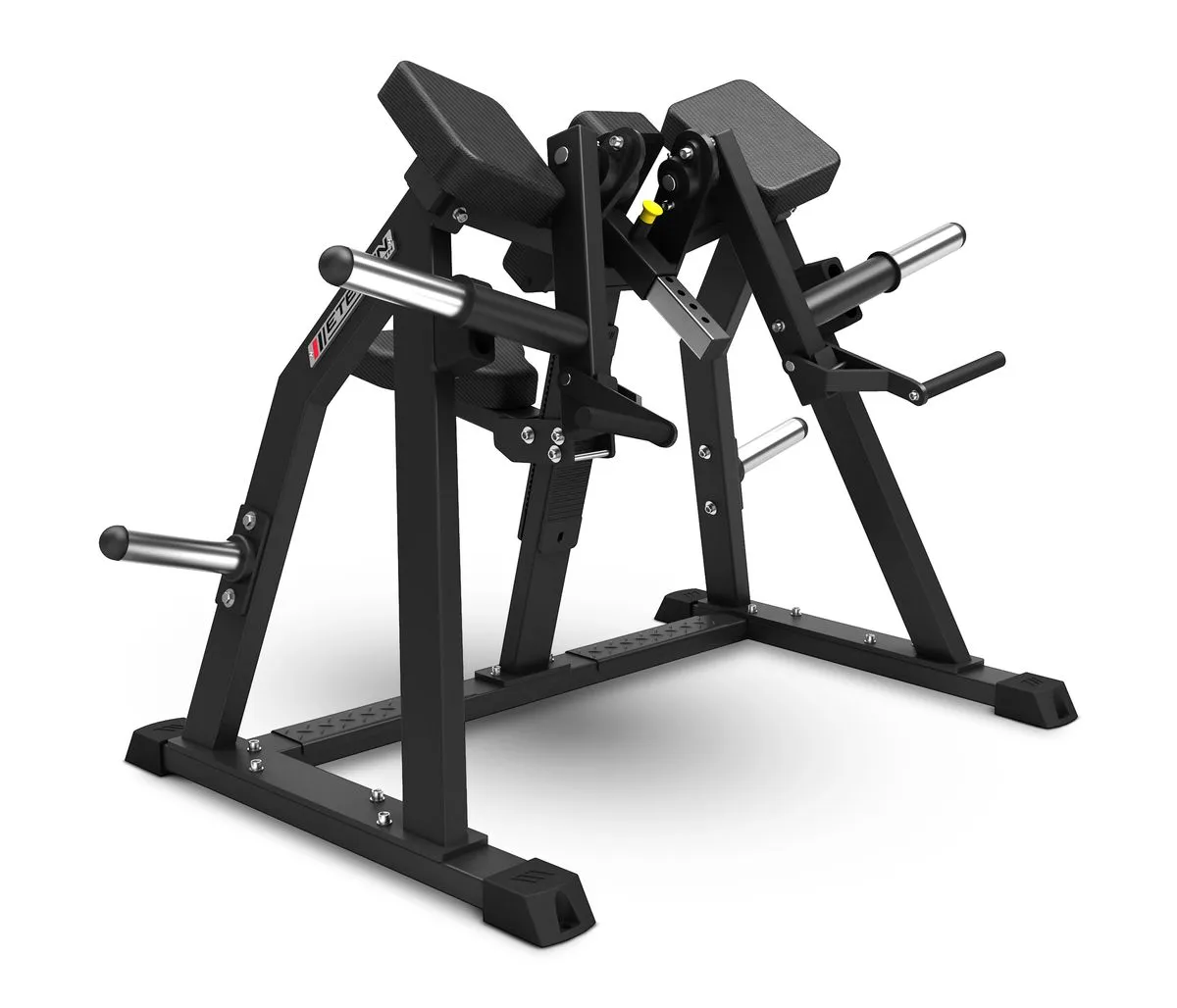 2 épis de chargement en acier inox pour disques olympiques disposés de chaque côté de la machine