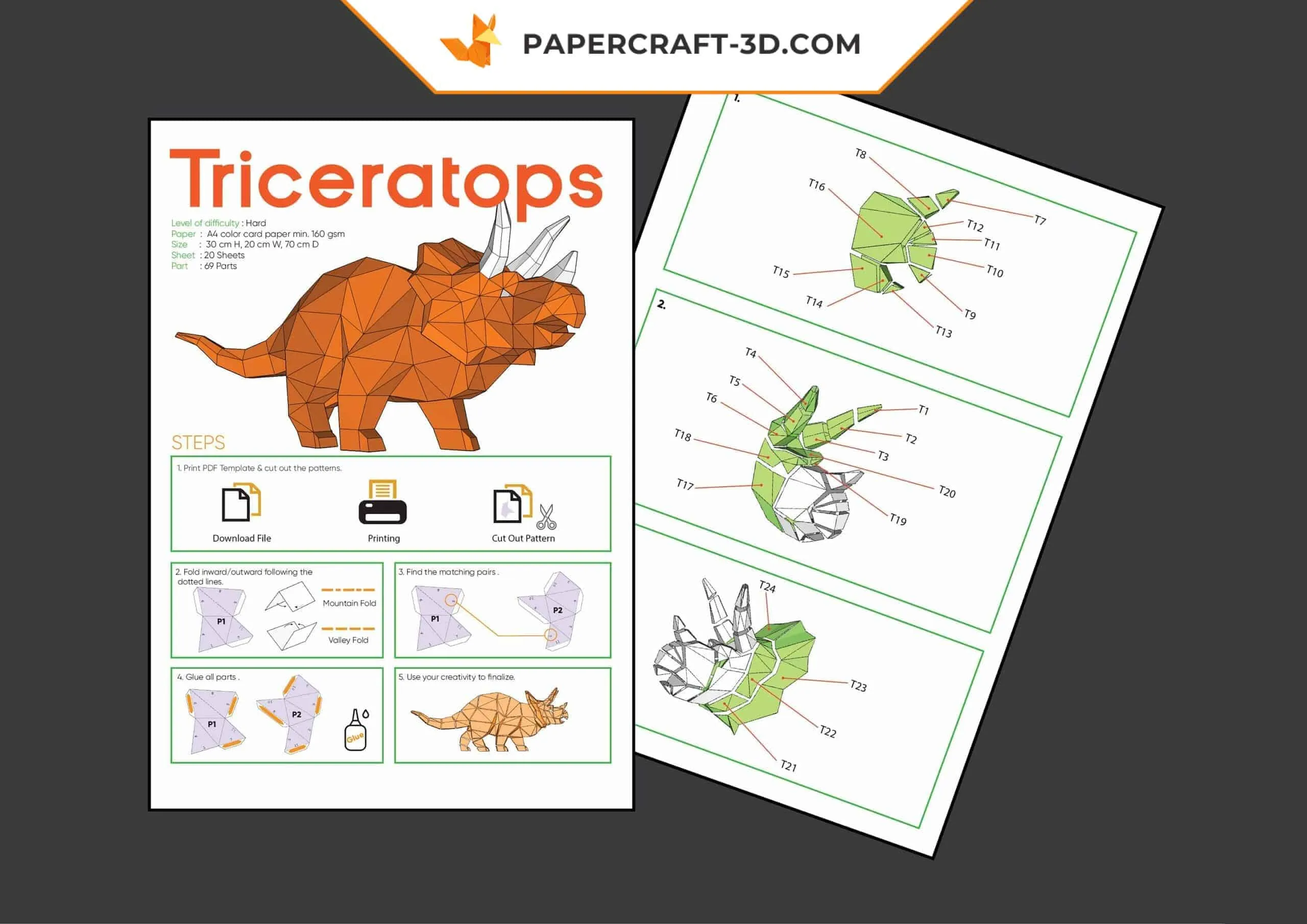 Caractéristiques techniques du papercraft de tricératops en origami 3D