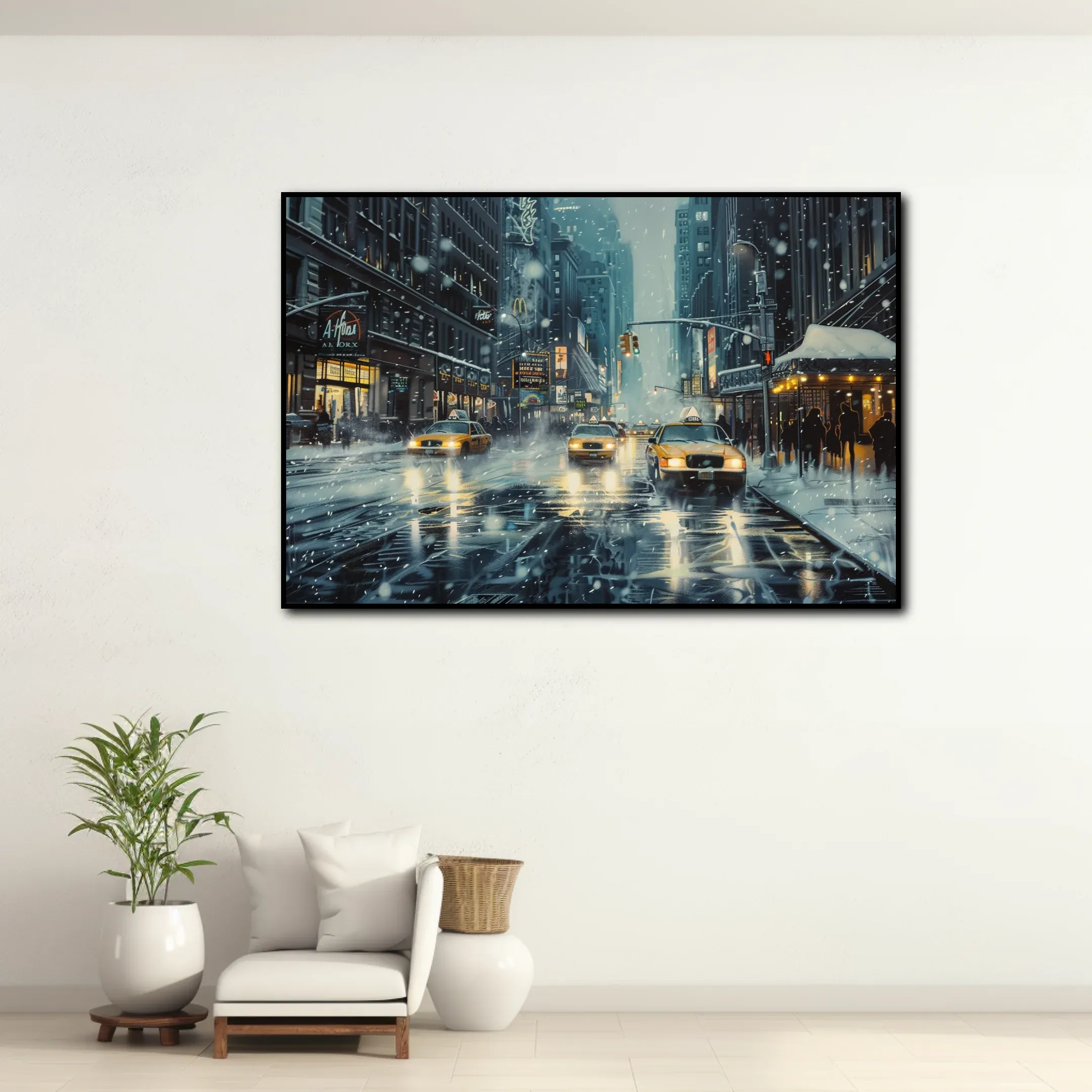Saisissez l’essence de la vie urbaine avec cette toile captivante, représentant la splendeur givrée de New York en hiver. Parfaitement adaptée à l’embellissement de votre espace de vie, cette pièce est une fenêtre ouverte sur les scintillantes avenues enneigées de la ville qui ne dort jamais.