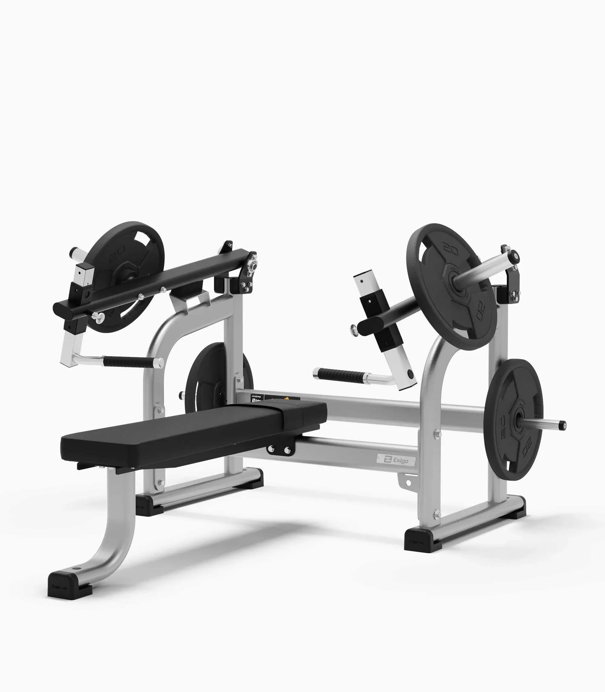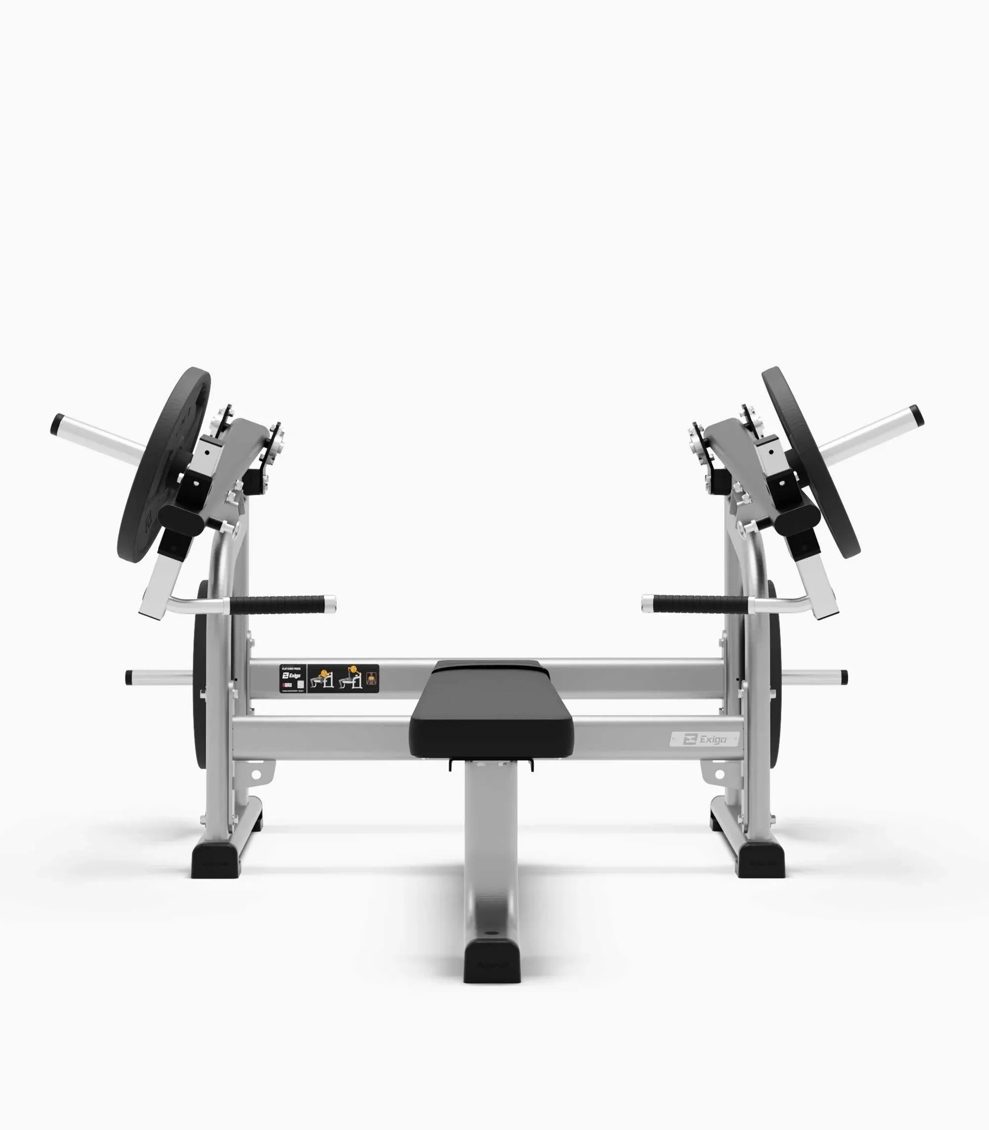 La presse pectoraux iso latérale position couchée à charge libre et mouvement convergent de Exigo Fitness est conçue pour simuler un développé couché de type olympique et cibler les muscles pectoraux en utilisant un modèle de mouvement naturel.