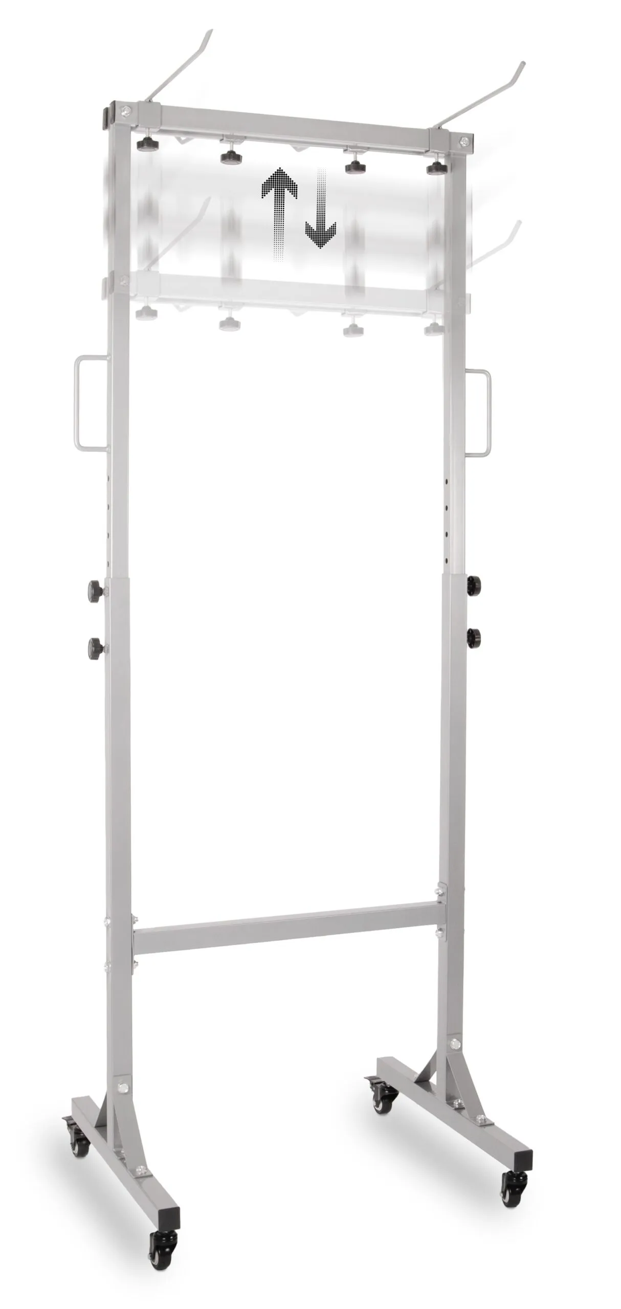 Deux roulettes sont munies de freins, ce qui permet de ranger le chariot en toute sécurité. La distance entre les œillets peut être réglée en continu des deux côtés jusqu’à un maximum de 59 cm. Le produit convient donc à tous les tapis à œillets disponibles dans le commerce.