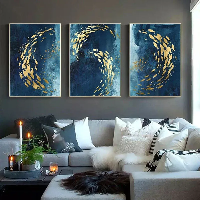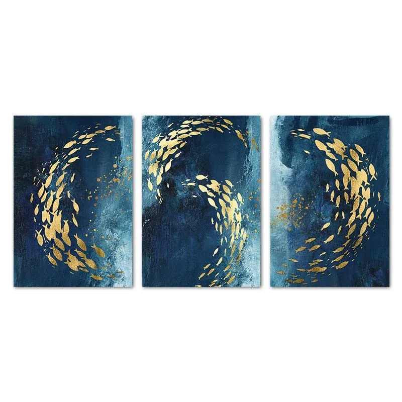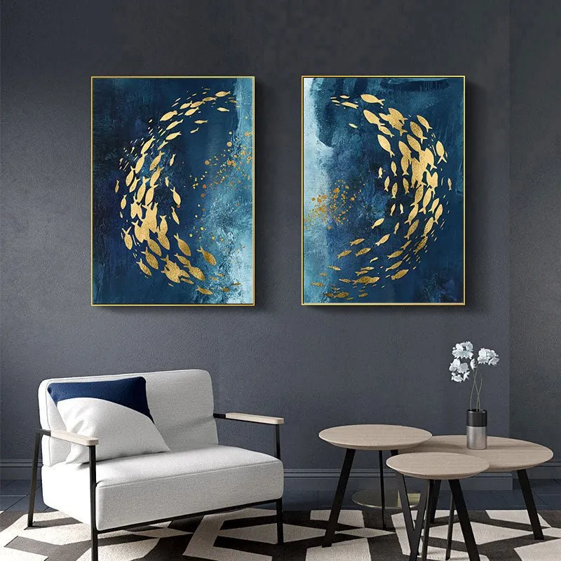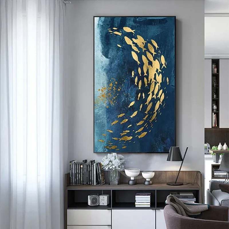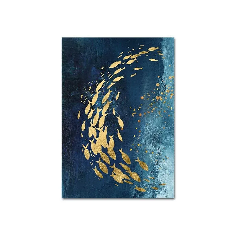 Le fond bleu intense et les poissons couleur or représentent une oeuvre d’art qui vous inspirera et vous enchantera. Commandez le vôtre aujourd’hui et profitez d’un style unique et abordable!