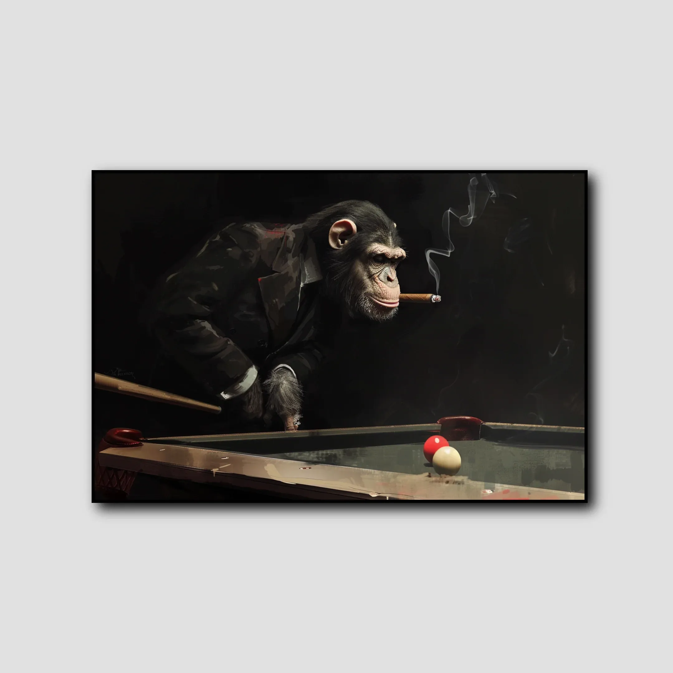 Transformez votre intérieur avec ce fascinant tableau contemporain, où l’on découvre un singe élégamment vêtu, débordant de charisme autour d’une partie de billard. Ce jeu d’image audacieux apporte une touche de sophistication et d’originalité, tout en offrant une dose d’humour subtil à votre décoration murale.