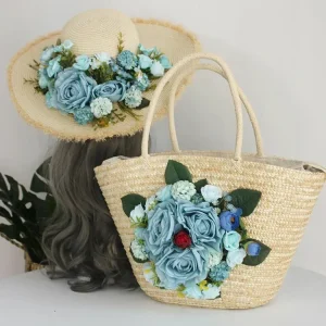 Sac de plage et chapeau en paille à fleurs pour femmes